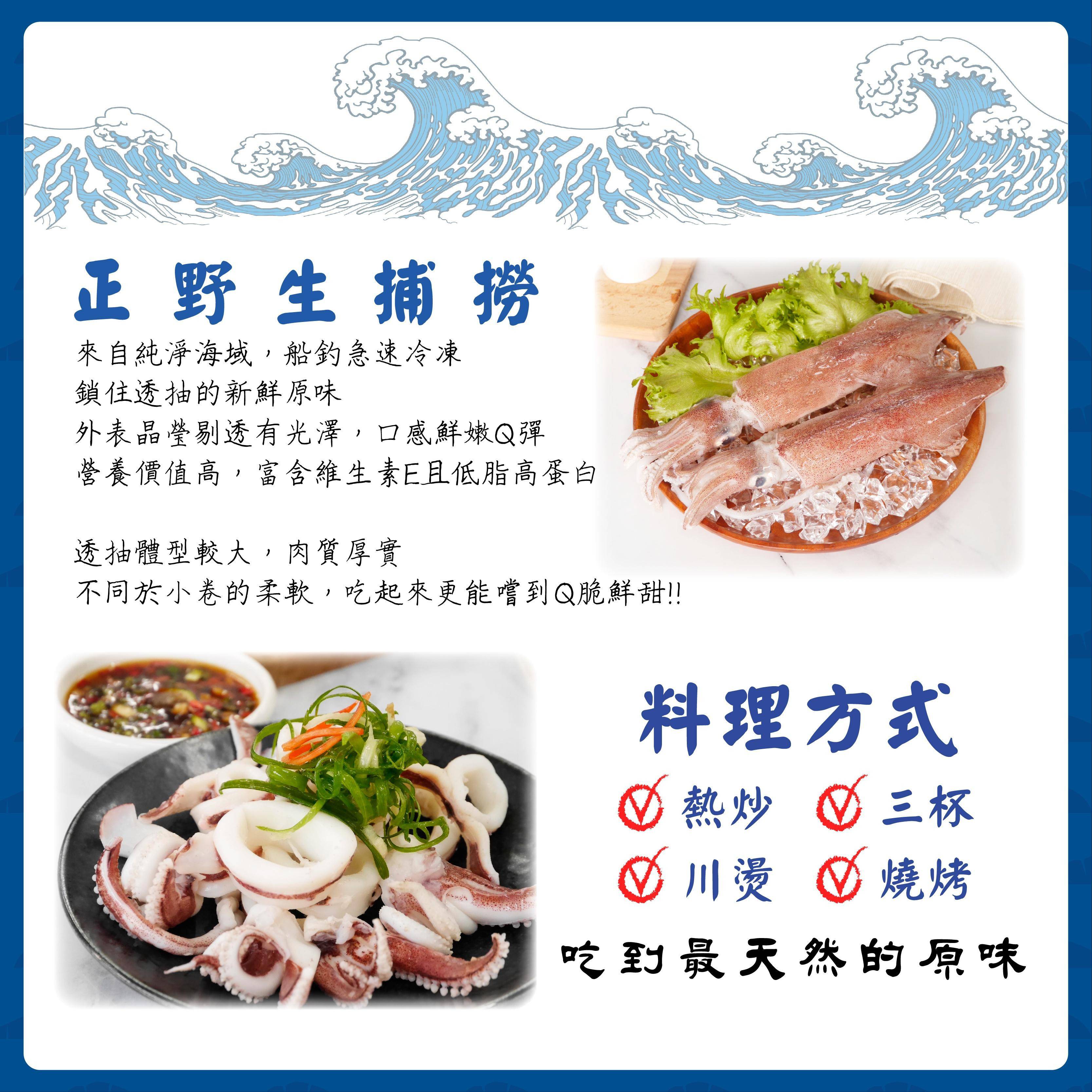來自純淨海域,正野生捕撈,船釣急速冷凍,鎖住透抽的新鮮原味